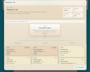 - Research upgrades that improve mining output and efficiency