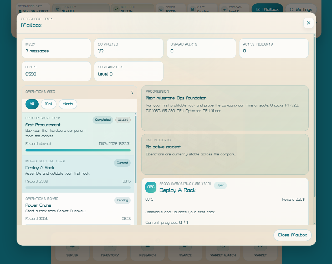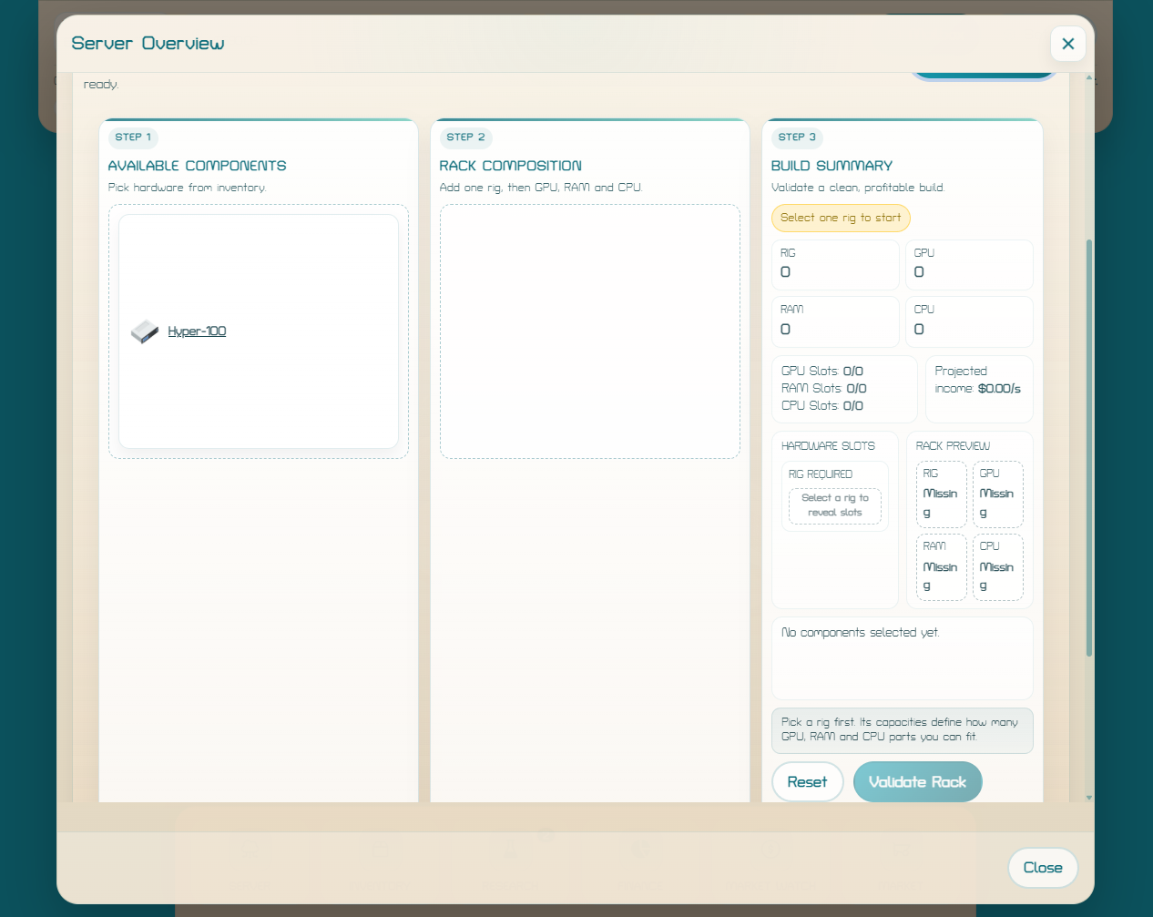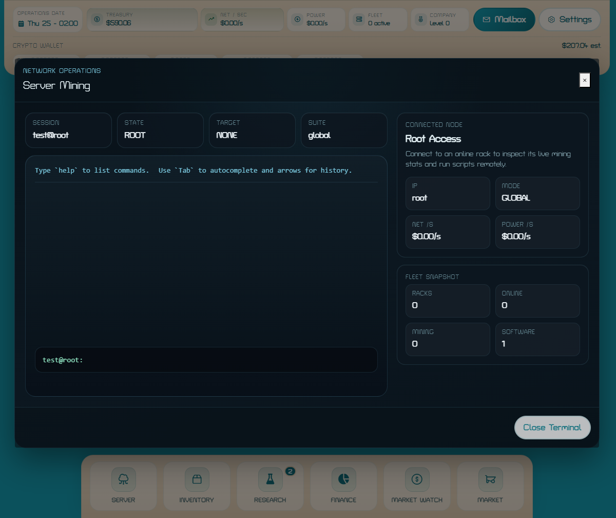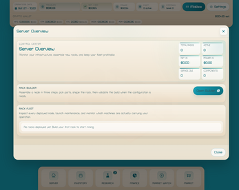 You start with just enough money to assemble your first rack, bring it online, pick a coin to mine, and grow your business one upgrade at a time.